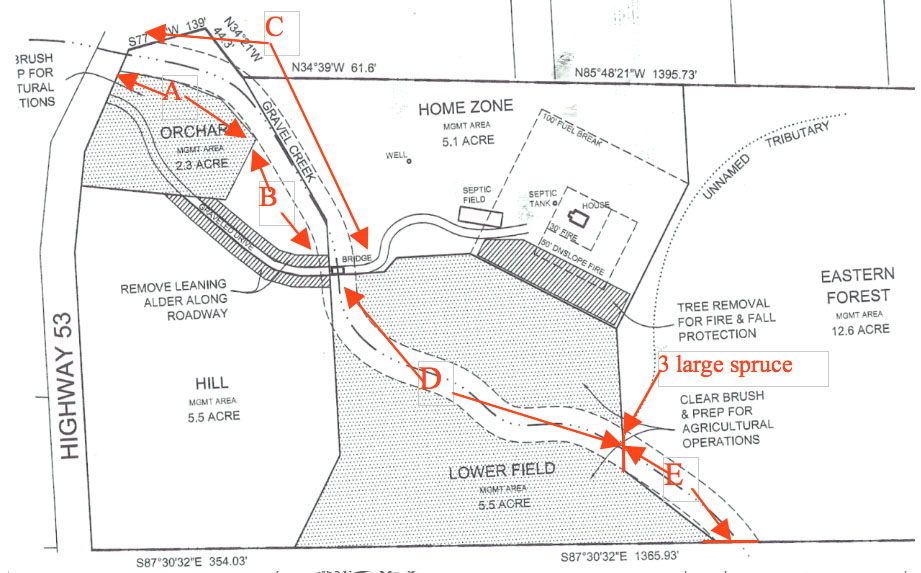 They have a wide array of plant species available, and were interested in our opinions and requirements for the project. After doing development work in the Peace Corps, I recognize this as a healthy attitude. If you don’t have enthusiastic owner buyoff, you don’t really get sustainability. Here we see the proposed plant mix for the project. They designed the species mix, all we asked was that they not use cottonwood, and we like hemlock and cedar so to go heavier on those, within the normal bounds of what was appropriate. They also adjusted the width of their work area to accommodate our planned land uses. For example, they are only working within 15 feet of the creek at the orchard area, but are working out to 50 feet the lowland areas.