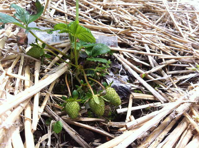 That aside, things are proceeding apace. Our certified-for-trade scale is on order, as is the paperwork from the state to operate it. Other knicknacks for the market are coming together as well, such as the canopy to cover our stall and nifty Peace Crops stickers to cover our belongings, bumpers, and friends. And the produce is keeping pace: the strawberries are starting to form, so I need to go out and get some bird netting to cover them.