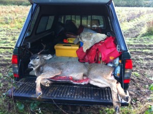 The rest of the morning was pretty procedural, in a homesteader-frontiersman sort of way. I locked the hubs on my 4×4, narrowly avoided getting stuck in some REALLY muddy fields, and was able to haul out the deer. Although I’ve helped my dad gut a deer twice, I’d never done it by myself, and I was a little nervous about it. So much so, in fact, that I bought a book (Basic Butchering of Livestock and Game), thus adding even more to the $50 already spent. More than the book or my experience with dad, though, what was mostly relevant was my Peace Corps experiences helping my neighbors slaughter and butcher livestock in Guatemala. Who knew?